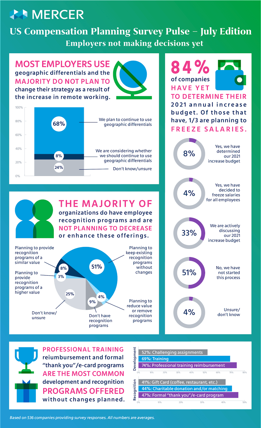 According to the latest Mercer Compensation Planning survey, a majority of companies struggled to finalize their annual payroll forecast. Of the total responses, 88% indicated they were “still discussing”, remained unsure, or hadn’t even begun working on their payroll budgets for next year. The remaining companies indicated they would be freezing salaries.
